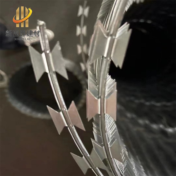 刀片刺绳是一种由热镀锌钢板或不锈钢薄板冲压成刀片状,再与高张力镀锌钢丝芯线组合而成的新型防护网,主要用于监狱、军事基地、交通设施隔离带及私人别墅等场所的防盗隔离。它具有防护性强、耐腐蚀、美观实用、施工便捷和经济实惠等特点。 国内最常见的规格为BTO-22,规格为:刀片厚0.5±0.05mm,心线直径2.5±0.1mm,刀长22±1mm,刀宽15±1mm,刀间34±1mm。